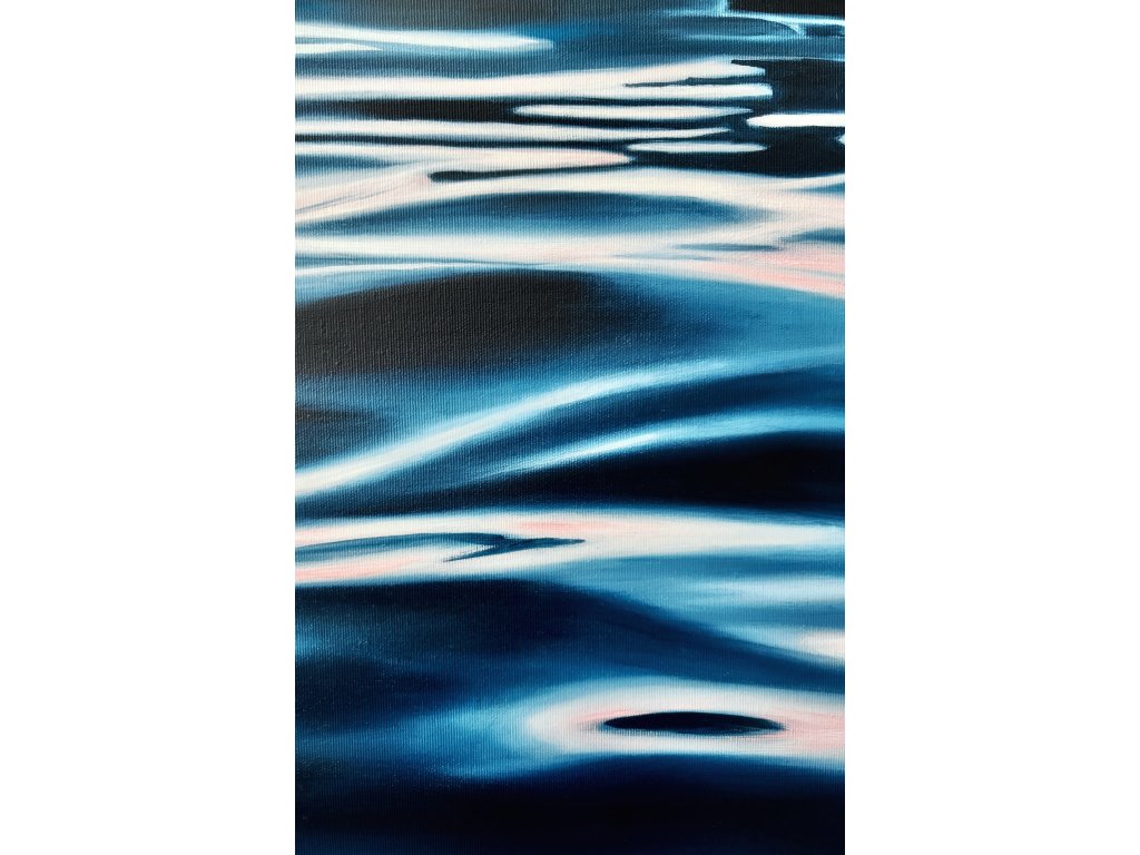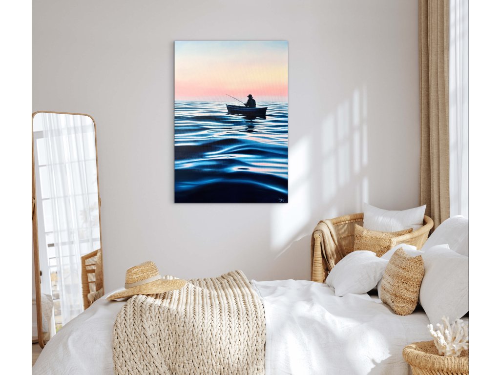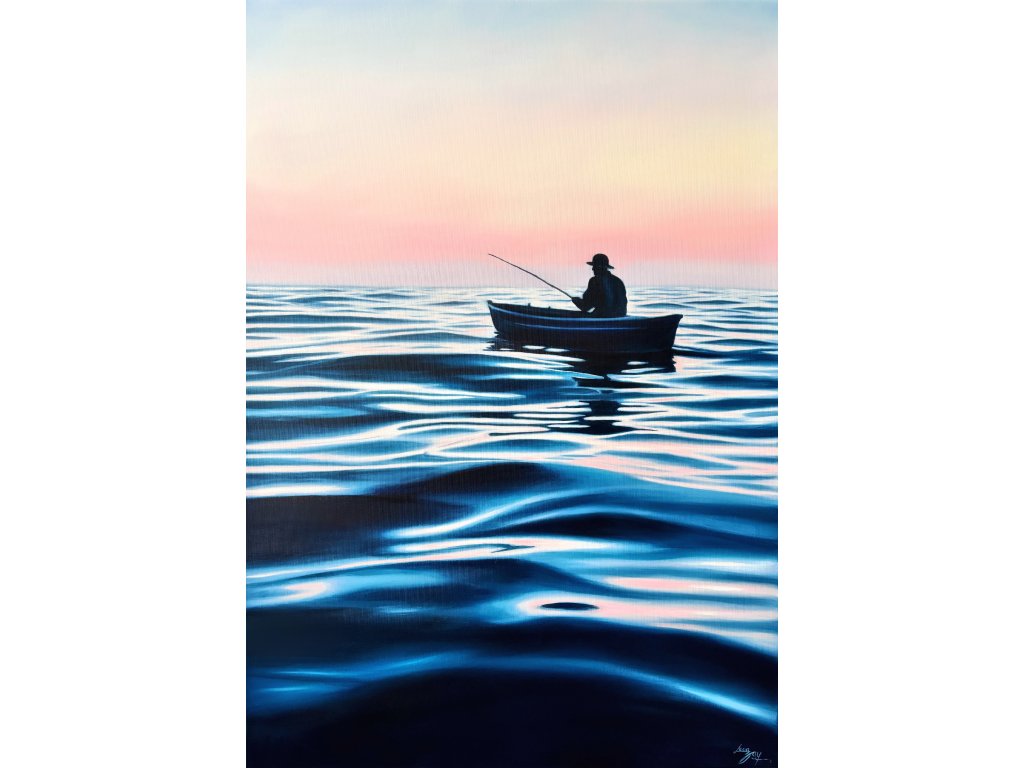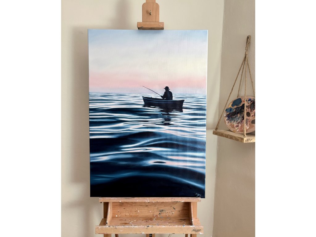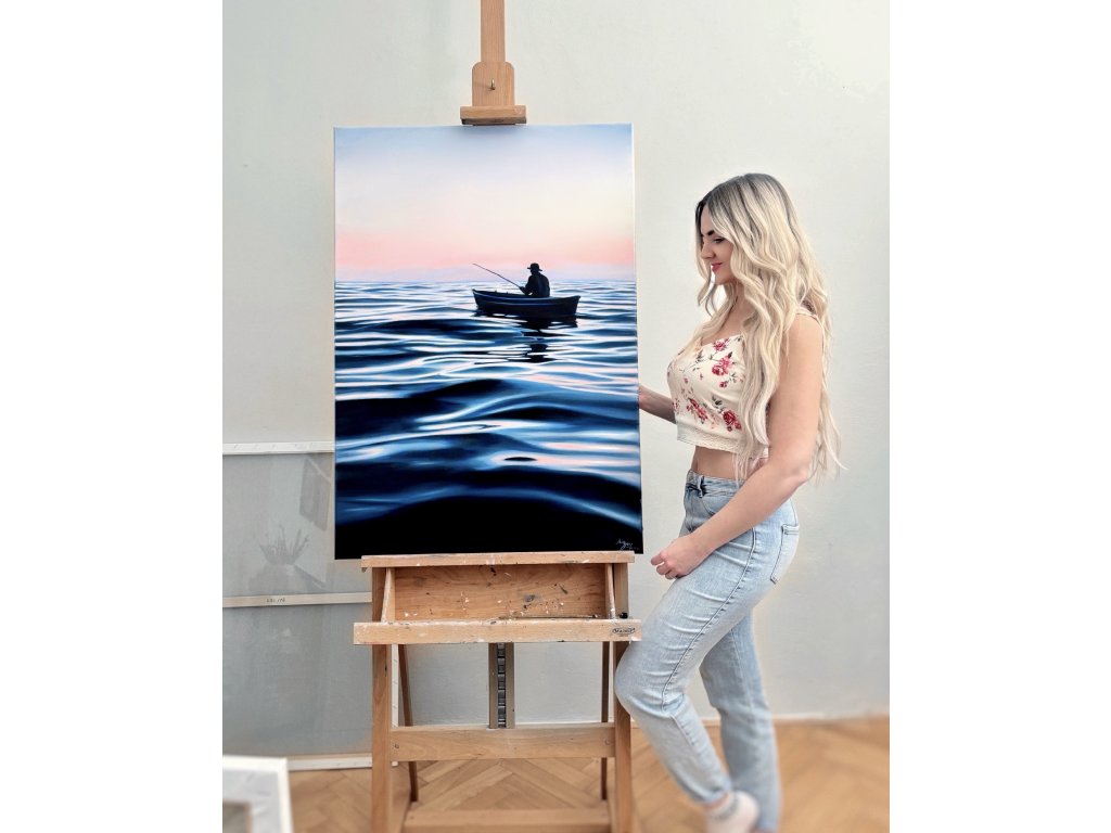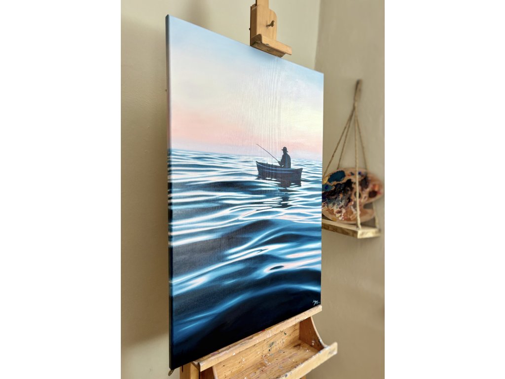 Obraz zachycuje ten prchavý moment absolutního klidu, kdy se den teprve probouzí a hladina vody zrcadlí první hřejivé tóny svítání. Při malbě jsem se snažila zachytit ten hluboký pocit vnitřního míru, který člověk zažívá, když je o samotě s nekonečným obzorem. Je to oslava ticha, trpělivosti a jemné dynamiky vody, která nás spojuje s přírodou v její nejčistší podobě.