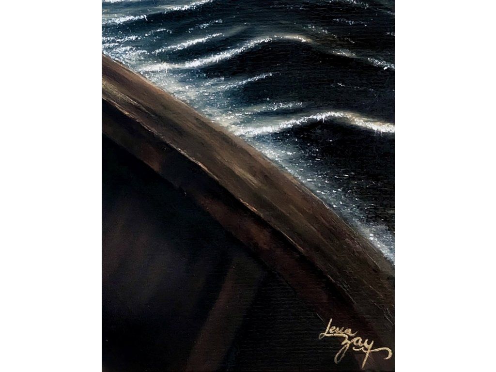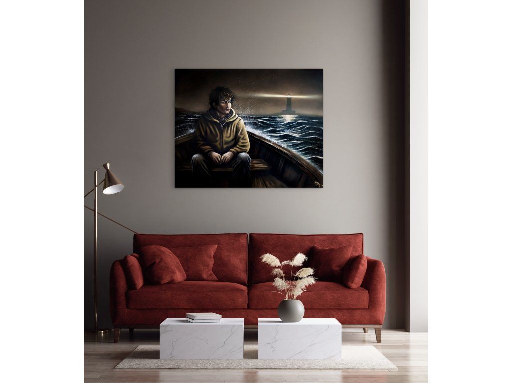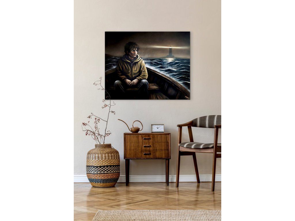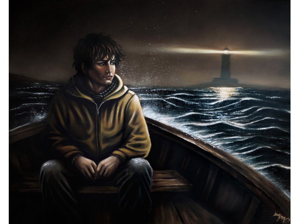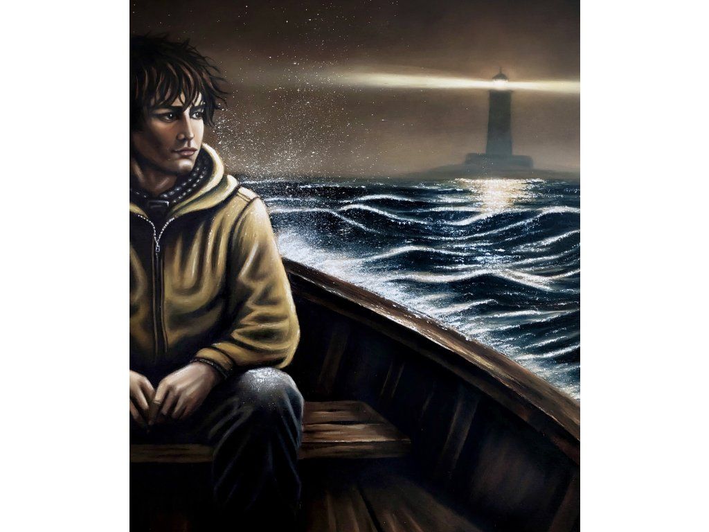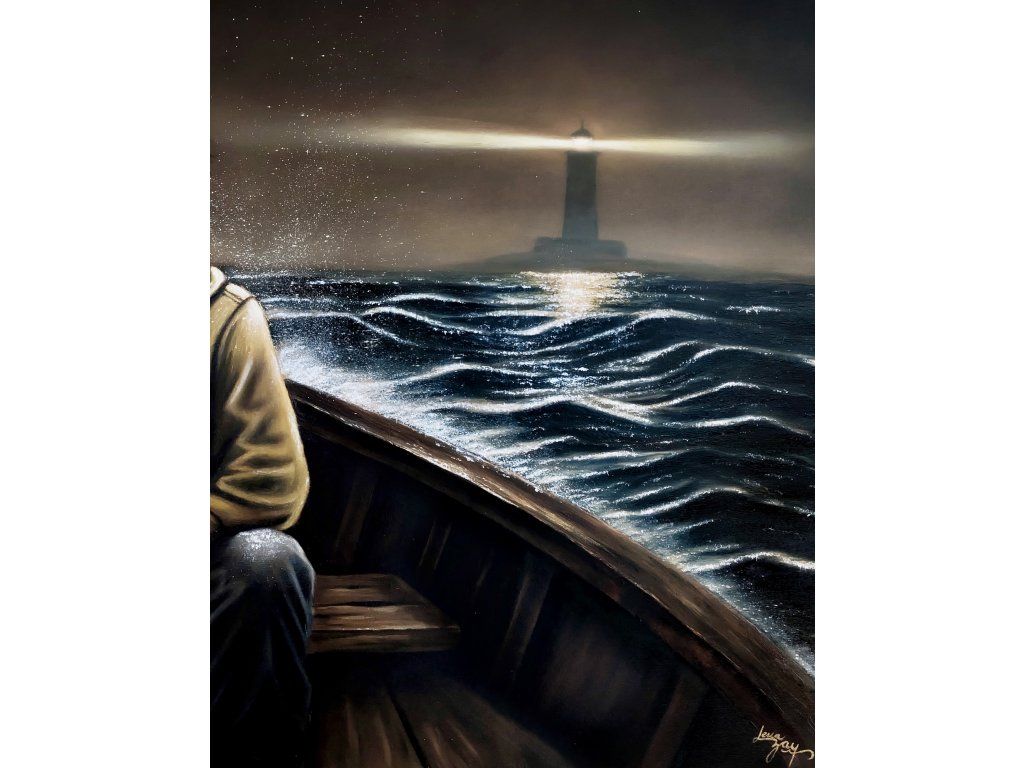 Dívat se jinam… Postava v té lodi hledí do tmy, i když mu za zády svítí maják. Tenhle obraz jsem namalovala o té naší zvláštní schopnosti nevidět to dobré, co nás provází. O světle, které tam pro nás je, i když jsme k němu zrovna otočení zády.