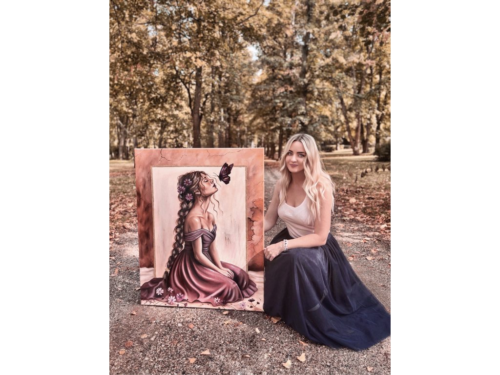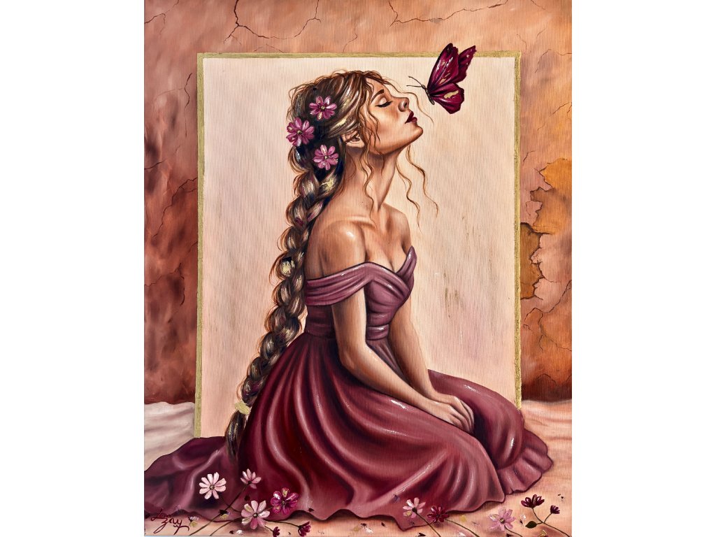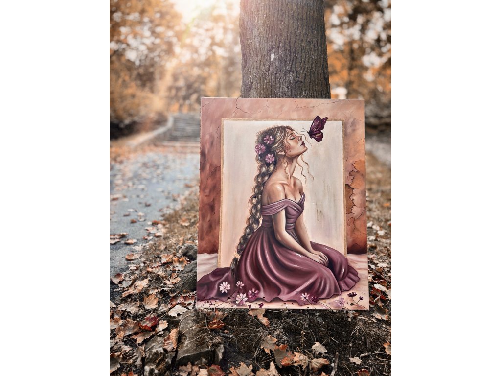 Když jsem začala malovat tento kousek, přiletěl mi do ateliéru motýl a v tu chvíli bylo jasné, že se stane symbolem znovuzrození a lehkosti přítomného okamžiku. 🦋